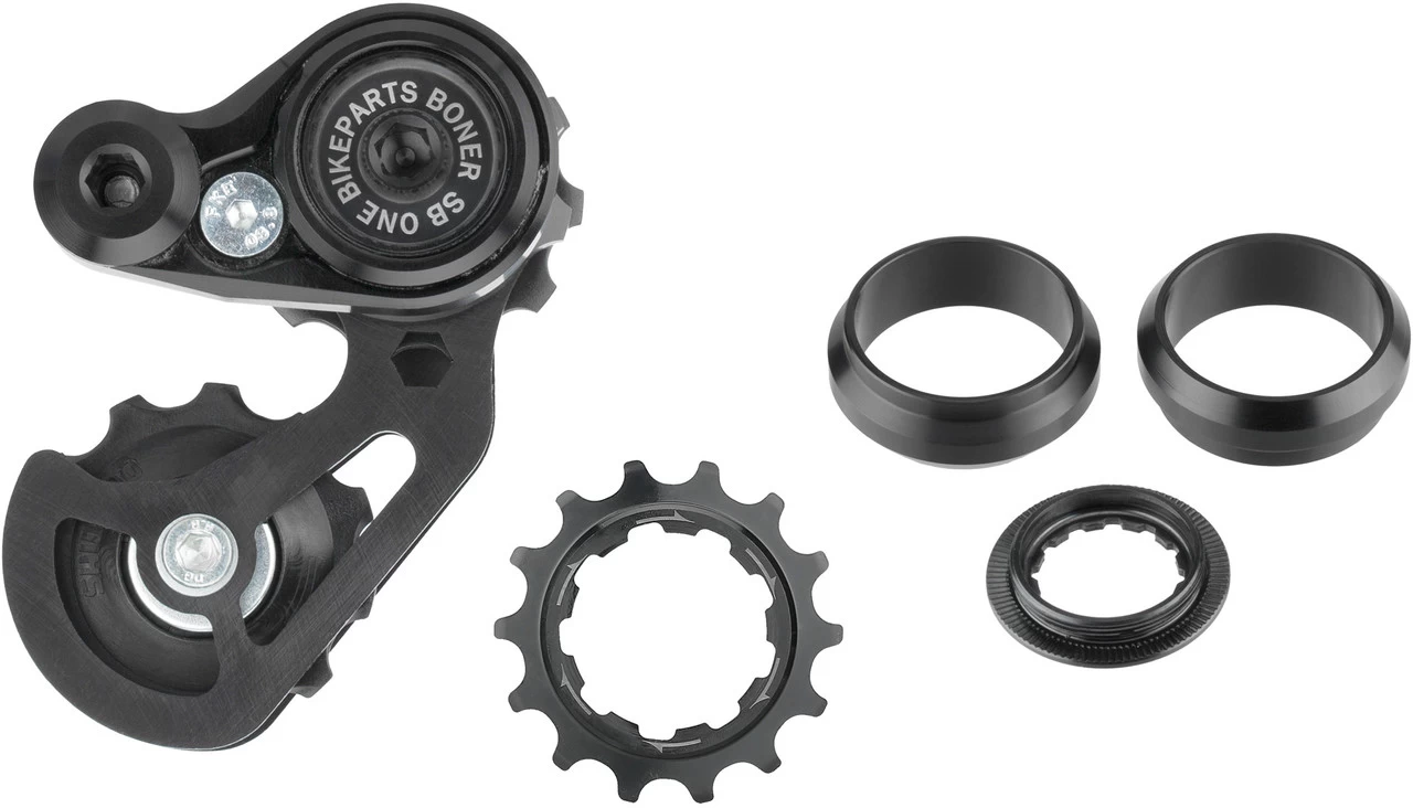Technische Daten Kettenspanner:Einsatzbereich:DownhillMaterial:Aluminium (EN AW 7075-T6)Ritzelgrößen:13, 14 ZähneEinstellbereich Kettenlinie:0 – 18 mm, stufenlosKompatibilität:Shimano Freilaufkörper mit HG-Verzahnung9/10/11-fach KettenFeatures:sehr hohe SpannkraftArretierung des Käfigs mit 6 mm Innensechskant-Schlüssel zur leichteren Demontage des Hinterradsstufenlos einstellbare Ausrichtung zum Ritzel (Einstellbereich 18 mm)gekapseltes Spannsystem (Drehfeder kann nicht verschmutzen und dadurch stagnieren)einfache Montage am Schaltaugehochfeste AL-Legierungen: Konstruktion besonders haltbar und robustHerstellernummer:13 Zähne:SBO-G1BR-000 + SBO-MUD-000 + SBO-SSR-01314 Zähne:SBO-G3DH-000 + SBO-MUD-000 + SBO-SSR-014Lieferumfang:1 x Kettenspanner SB ONE Boner DH2 x Spacer SB ONE Boner1 x Lockring SB ONE1 x Ritzel SB ONE 13 oder 14 Zähne
