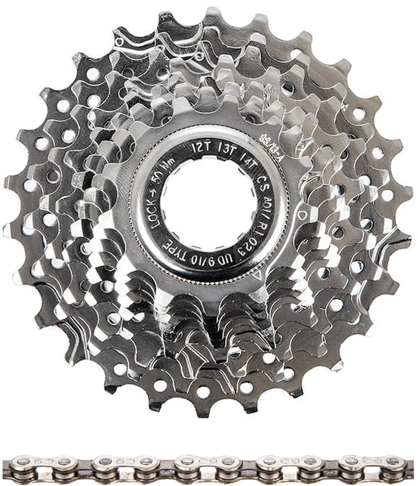 Spezifikation Kassette:Einsatzbereich:Road, CyclocrossSchaltstufen:9-fachAbstufungen:12-23Z, 13-23Z, 13-26Z, 13-28Z, 14-28ZMaterial Ritzel:Stahl (Chrom beschichtet)Freilaufkompatibilität Kassette:Campa Rotor:9-fach CampagnoloTechnische Daten Kassette:Serie:VeloceRitzelträger:StahlSpezifikation Kette:Einsatzbereich:RoadSchaltstufen:9-fachTechnische Daten Kette:Gliederzahl:114Breite:6,8 mmLaufrichtungsgebunden:NeinMaterial:Stahl (Chrom-Nickel-Finish)Technologie:Ultra Drive™