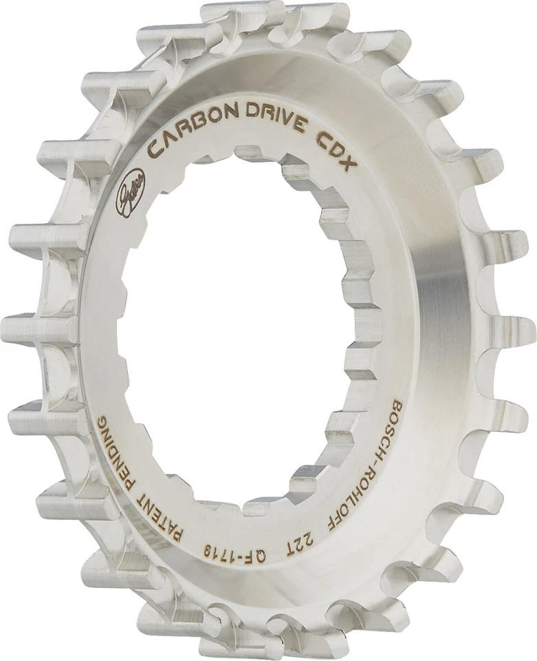 Spezifikationen:Einsatzbereich:Touring & Trekking, Cross Country, All MountainBefestigung:Direktaufnahme an Bosch Gen2-MittelmotorZähne:22 ZTechnische Daten:Breite der Zähne:11 mmZahnteilung:11 mmRiemenlinie:54,7 mmDicke der Riemenscheibe an der Aufnahme:4,5 mmVersatz:8,2 mm (Montagefläche), 6,0 mm (Mittellinie)Außendurchmesser:75,3 mmMaterial:EdelstahlKompatibilität:Bosch Gen2 Performance LineBosch Gen2 Performance Line CXnur geeignet für Rohloff Speedhub 500/14 mit 135 mm oder 142 mm Einbaubreite aufgrund der spezifischen KettenlinieVerwendung eines Snubber zwingend vorgeschrieben (verhindert ein Überspringen des Riemens)Features:CDX-Niveau: High-End-Variante für hohe Belastungen und beste Performancegeeignet für Schlamm, Sand, Schnee und Eis sowie sämtliche Straßenmittlere Führungsnut (CenterTrack)hohe Laufleistungrobuster EdelstahlTechnologie:Gates Carbon Drive System