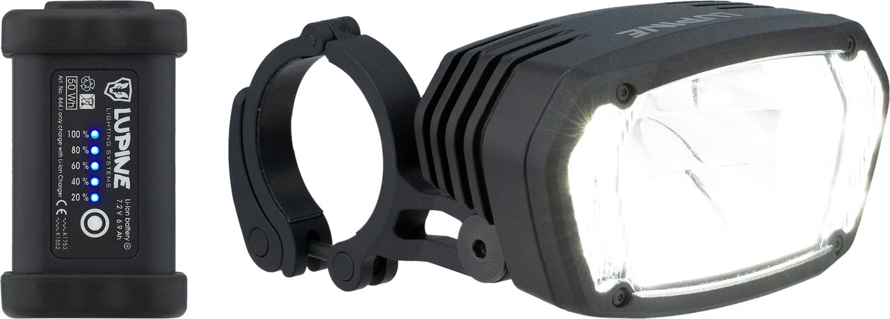 Spezifikationen:Ausführung:Frontlicht (weiß)Montage:LenkerLeuchtmittel:LED (9 x Osram Automotive)Leuchtkraft:2200 Lumen, 340 Lux (Fernlicht), 1300 Lumen (Abblendlicht), 800 Lumen (gedimmtes Abblendlicht), 180 Lumen (Tagfahrlicht)Leuchtweite:370 m (Fernlicht)Leuchtdauer:1:45 (2200 Lumen) – 20:00 (180 Lumen) StundenBetriebsmittel:Akku (Li-Ion), externTechnische Daten:Leuchtmodi:Tagfahrlicht, Abblendlicht, FernlichtSpannung:7,2 VLadestandsanzeige:JaLadezeit:3:40 StundenSchutzklasse:IP68, IK09Maße (H x B x T):48 mm x 84 mm x 45 mmMaterial:Aluminium (6061)Schalter:Bluetooth-Fernbedienung zur LenkermontageFreigaben:Zulassung im Straßenverkehr:Ja, für Fahrräder (nach §67 StVZO)Prüfziffer:K~~1753Features:Lupine Light Control Appwasserdicht und schlagfest nach IP68 und IK09echte Tagfahrlichtfunktion geprüft nach ECE R87automatischer Wechsel zwischen Tagfahrmodus und Abblendlicht dank Stereo-SensorikEco Modus für erhöhte Laufzeit des Fernlichts mit 1600 LumenUmschaltpunkt zwischen Tagfahrmodus und Abblendlicht ist kalibrierbarGehäuse gefräst aus einem einzigen Stück AluminiumCNC-gefräster Schnellspanner zur LenkermontageLadestandsabfrage akustisch und visuell über 5 LEDs am Akkuinklusive Bluetooth-Fernbedienung zur Montage am Lenker mit LeuchtanzeigeKlettbänder mit Antirutschbeschichtung in zwei Längen zur Befestigung des AkkusEinsatzbereich -25 °C bis +70 °CAusführungen:schwarz / 2200 Lumen, 31,8 mm: