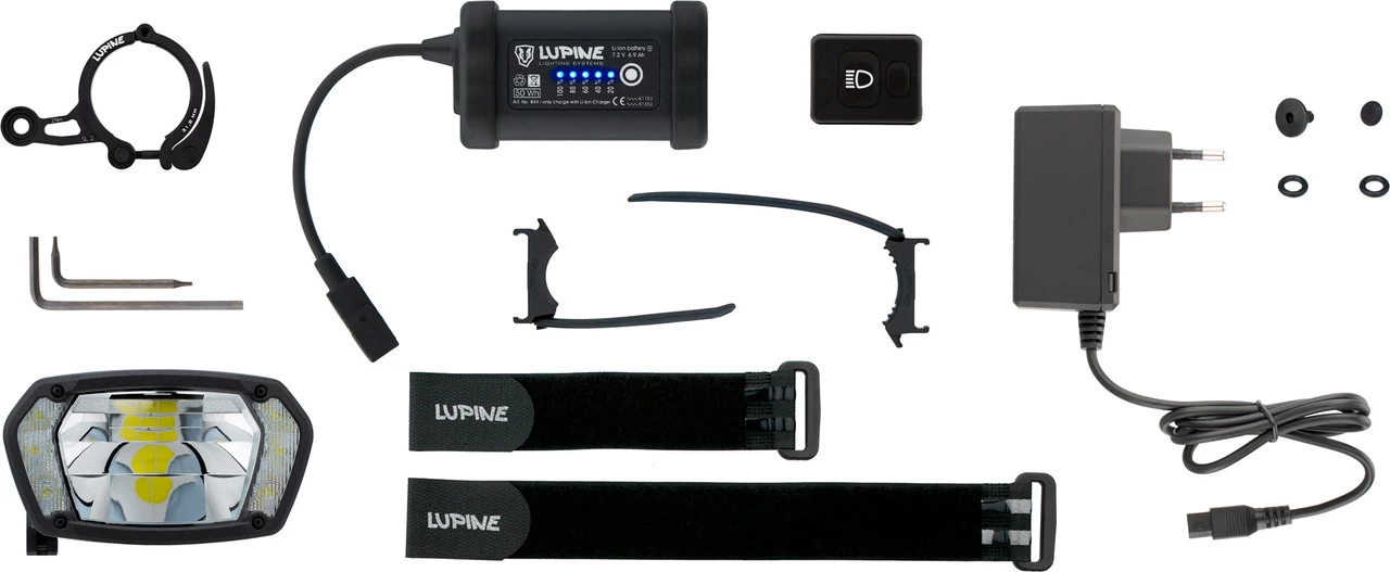 Lenkerklemmung:35 mmHerstellernummer:d4304-035Lieferumfang:1 x Lampenkopf Lupine SL AX1 x Li-Ion Akku Lupine SmartCore 6,9 Ah1 x Schnellspanner Lupine1 x Bluetooth Funkfernbedienung Lupine1 x Lenkerhalter Lupine Peppi V5 für Bluetooth-Fernbedienung für 22 mm Durchmesser1 x Lenkerhalter Lupine Peppi XL für Bluetooth-Fernbedienung für 32 mm Durchmesser1 x Ladegerät Lupine “ Wiesel“1 x Akkuklett lang1 x Akkuklett kurz